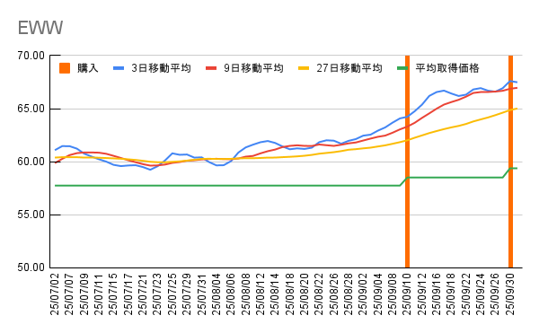 • 久しぶりにEWWを確認したところ、どちらかというと上がっているように見えるので、追加購入資金がもうないのですが、さらに28株(約30万円分)を成買し、保有数量は296株になりました