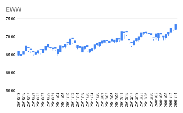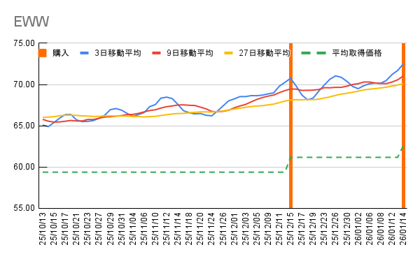 - EWWが上昇しているように見えるので、24株(約30万円分)成買し、保有数量は195株になりました