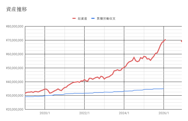 - 2/1時点の総資産は、69,267,000(1/1)→70,600,000(2/1)と、130万程度の総資産の増加になりました