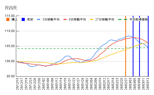 • RWRを更に下がっているように見えたので、ほぼ全部売却として30株成売りし、+20,654円の利益確定になり、残りは3株となりました
