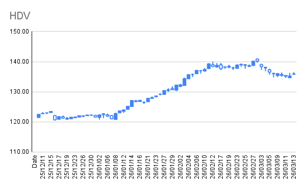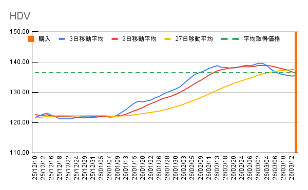 • もともと、そろそろ高配当株がどのようなものか、購入してみようと思っていましたが、原油高騰等、スタグフレーション懸念らしいとのことで、HDVを11株(約25万円)成買しました