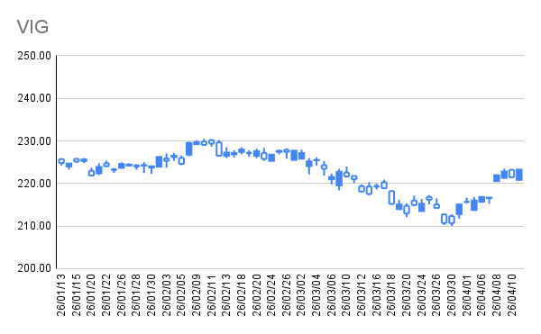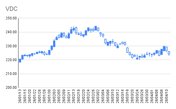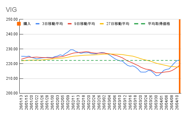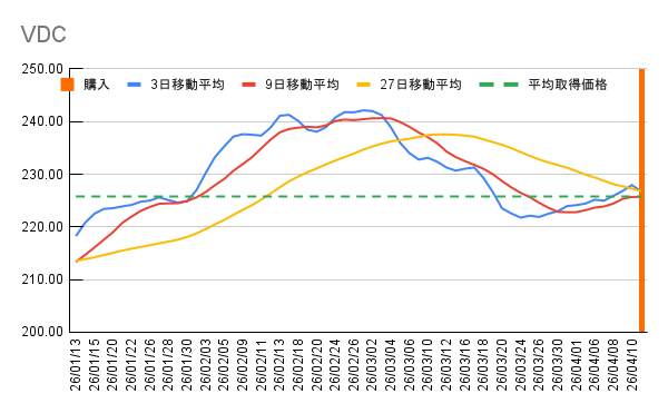2026/04/13 VDC,VIG成買結果 株式 2026.04.14 VDC 情勢は引き続き不明で、アメリカもホルムズ封鎖という予想外の話らしいですが、米国のデフェンシブを購入して様子見たいので、生活必需品系のVDCも購入してみまして、VDCを7株(約25万円)成買しました 約定後保有残高 銘柄現在保有数量平均取得価格現在値時価評価額評価損益VDC7 株225.77 USD224.20 USD249,095 円-2,856 円 約定後VDC日足チャート <<次のVDC記事へ(次の記事はありません)>>前のVDC記事へ(前の記事はありません) VIG こちらも成長増配のETFとのことで、VIGを7株(約25万円)成買しました 約定後保有残高 銘柄現在保有数量平均取得価格現在値時価評価額評価損益VIG7 株222.25 USD223.26 USD248,050 円+31 円 約定後VIG日足チャート <<次のVDC記事へ(次の記事はありません)>>前のVDC記事へ(前の記事はありません)